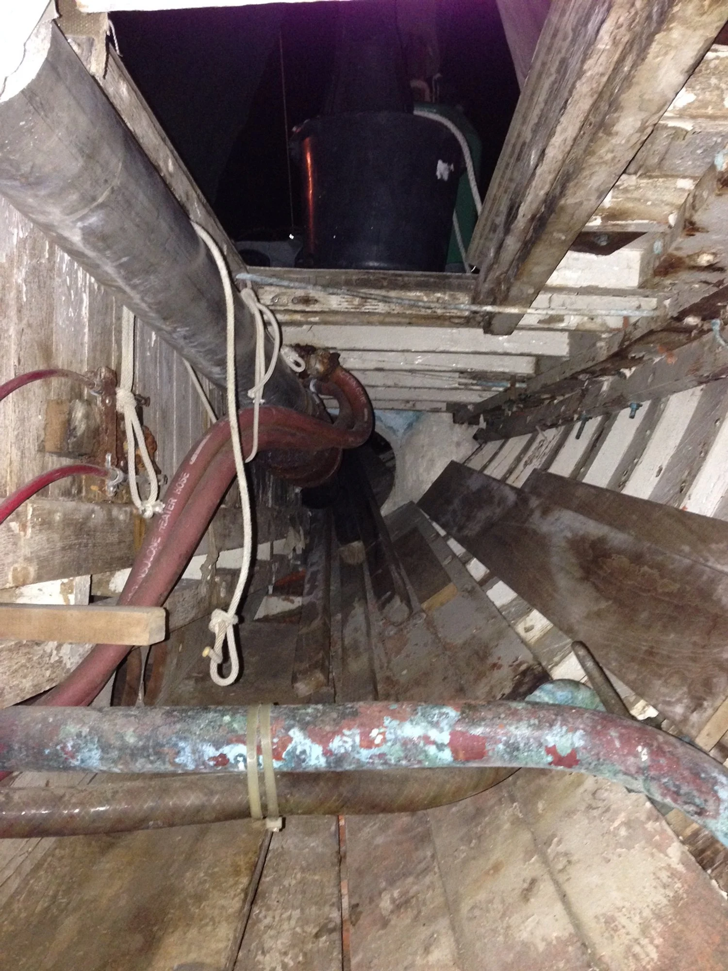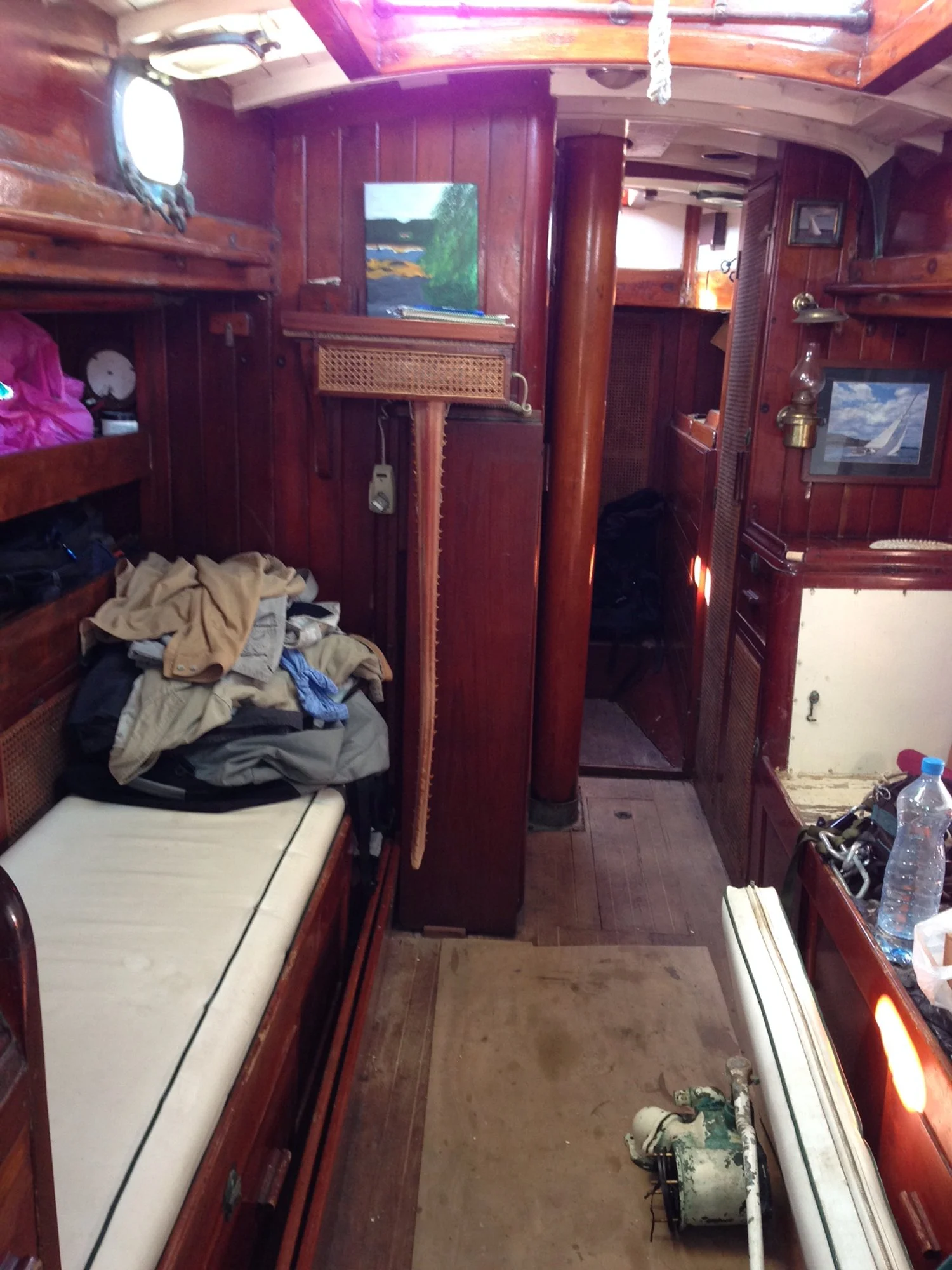 Estimated scope of work: she will need some wood replacement work around forward of the rudder post to solve a persistent leak, and four planks have sprung about 1/4 inch and need refastening. The rudder needs some rebuilding. She needs re-varnishing and repainting everywhere