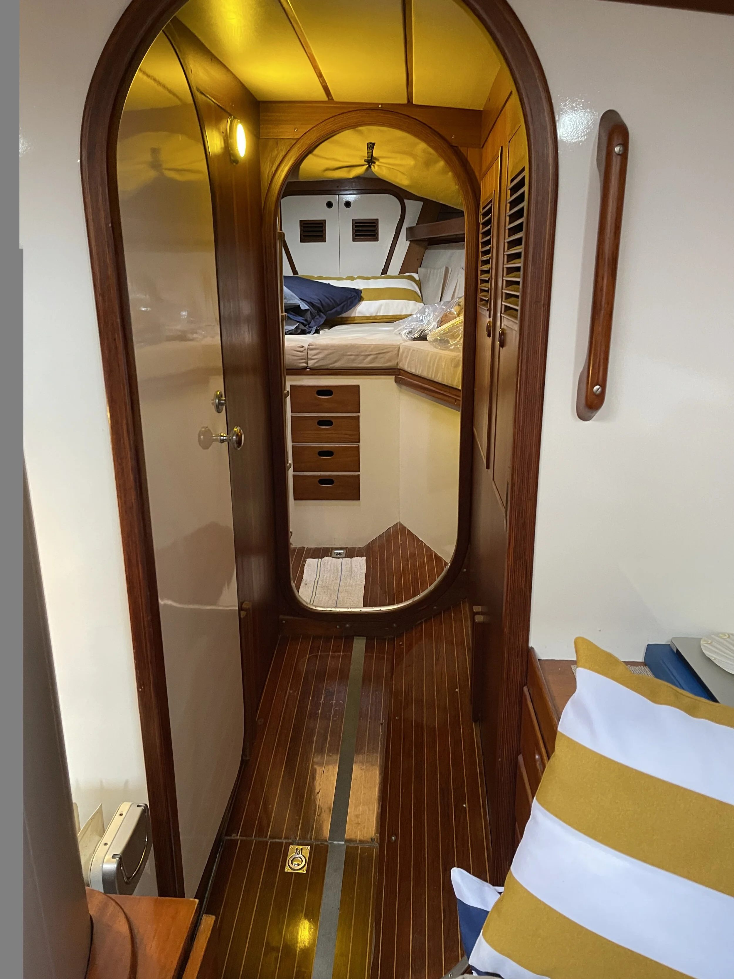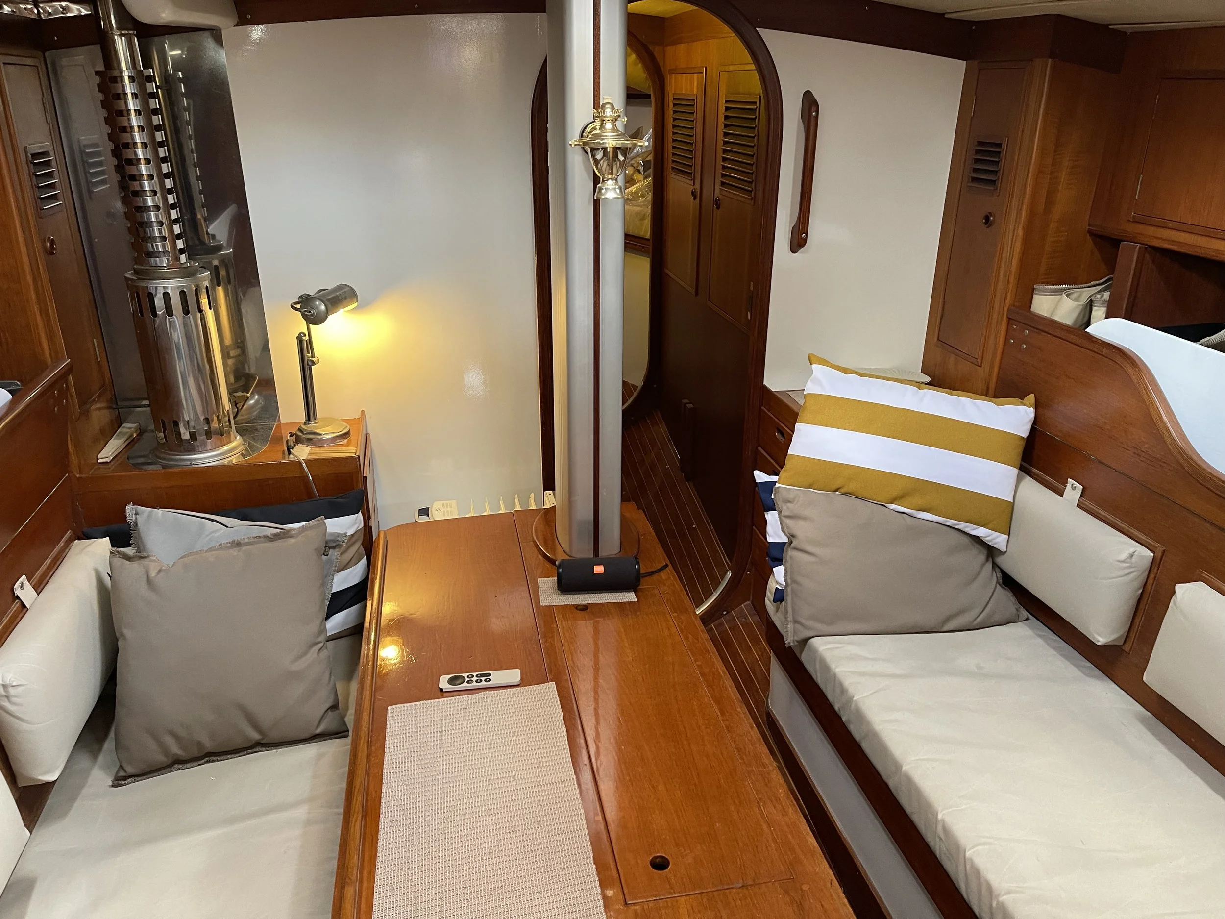 The boat has undergone a thorough overhaul, but its style and, where possible, equipment is still very original. Where technology has had to be renewed, we have tried to preserve style as much as possible. There is plenty of original movable storage, for example. all original Hood sails that came with the boat. Of these, the high-wind spinster and Storm fox are still in active use.